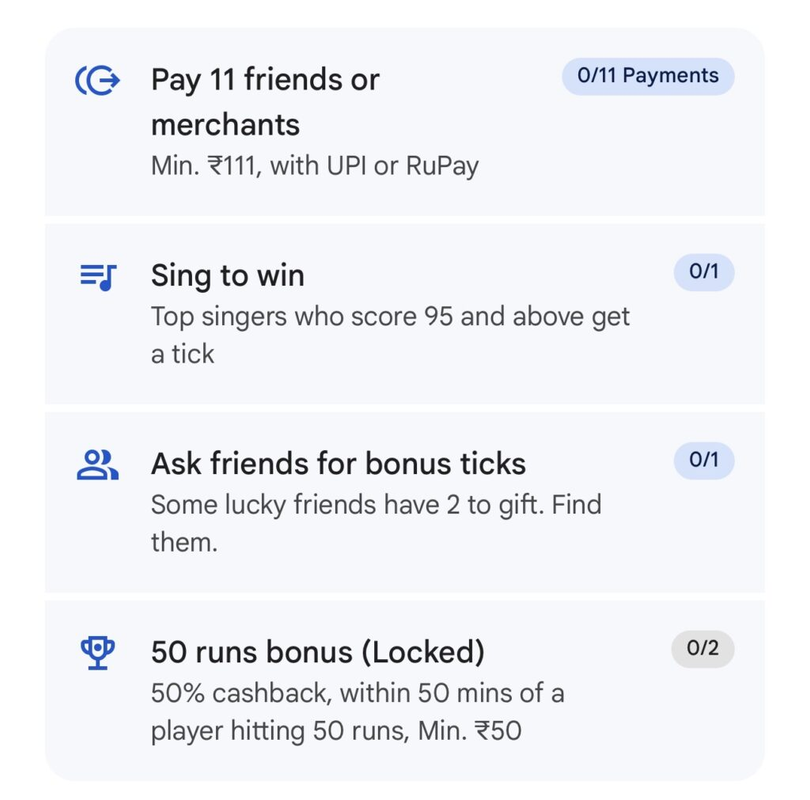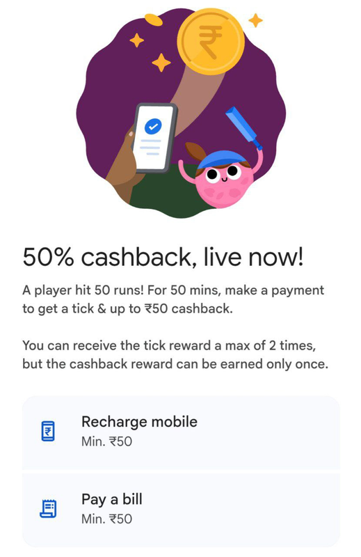 • Keep an eye on the Google Pay Cricket Banner during matches — the 50% cashback offers go live instantly after a player hits 50 runs.